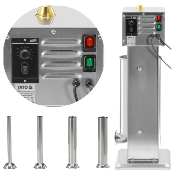 Elektryczna nadziewarka Yato 15l (YG-03382) do wyrobów wędliniarskich, idealna dla restauracji, wędzarni, zakładów mięsnych, agroturystyki, myśliwych i domów. Wyposażona w lejki 16/22/32/38 mm do produkcji kiełbas o różnej grubości.