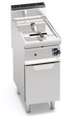 Płaszczyzna robocza i panele przednie wykonane ze stali nierdzewnej inox AISI 304.  Zaokrąglony zbiornik z obszerną częścią chłodną służącą do zbierania pozostałości potraw. Rurowe palniki w formie plastra miodu. System smażenia, utrzymując właściwości organoleptyczne oleju niezmienione, umożliwia gotowanie potraw w sposόb zdrowy oraz redukuje ilość koniecznych wymian oleju, zapewniając znaczną oszczędność. System zabezpieczający wyposażony w czujnik temperatury i termostat awaryjny, płomień pilotujący osłonięty. 7 pozycji ustawiania temperatury w zakresie od 110 do 190°C. Przybliżona maksymalna produkcja godzinowa 16,8 kg. Średni czas smażenia 5 minut. Podgrzewanie wstępne 10 minut (od 20 do 190°C.). Zapłon piezoelektryczny z osłoną silikonową. Nόżki nastawne ( wersja z obudową).