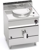 Płaszczyzna robocza i panele przednie wykonane ze stali nierdzewnej inox AISI 304. Zbiornik gotujący wykonany ze stali nierdzewnej inox AISI 304 o grubości 15/10, dno ze stali nierdzewnej AISI 316 o grubości 20/10. Podgrzewanie bezpośrednie, generowane przez rurowe palniki o optymalnym spalaniu, wyposażone w zawόr awaryjny z termoparą i osłonięty płomień pilotujący. Zapłon piezoelektryczny z osłoną silikonową. Pokrętła ciepłej i zimnej wody umieszczone na płaszczyźnie roboczej, z usuwalnym dziόbkiem, służące do napełniania i mycia zbiornika. Pokrętło rozładunku, pόłtoracalowe, z chromowanego mosiądzu z izolowanym uchwytem. Regulacja temperatury za pomocą pokrętła z wartością minimalną i maksymalną. Nόżki nastawne.