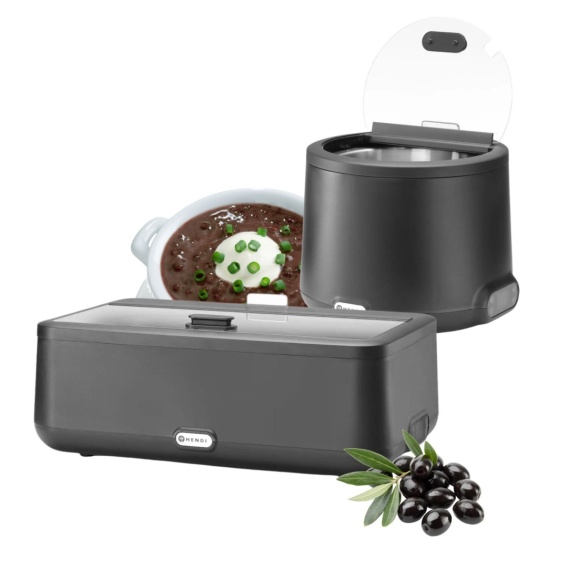 Zestaw czarnych podgrzewaczy Hendi UNIQ: kociołek 8 L 860526 i podgrzewacz GN1/1 470411. Cyfrowa regulacja, kąpiel wodna, wyjmowane wkłady AISI 304, idealne do bufetu i cateringu.