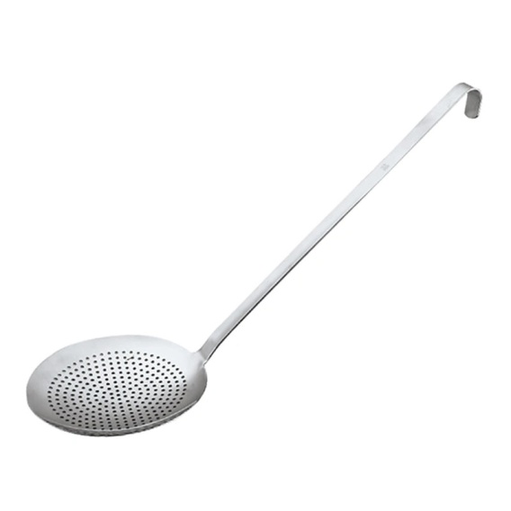 Łyżka cedzakowa z wysokiej jakości stali nierdzewnej, wyposażona w długi uchwyt zakończony praktycznym hakiem do zawieszania. Idealna do odcedzania makaronu, warzyw czy smażonych potraw, dzięki swojej wytrzymałej konstrukcji i wygodnemu uchwytowi zapewnia komfort użytkowania. Niezastąpiona w każdej kuchni, łącząc funkcjonalność z eleganckim designem.