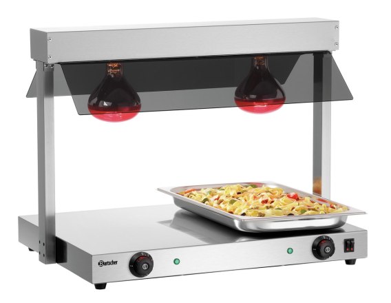 Mostek wyposażono w dwie niezależnie regulowane strefy grzewcze, co pozwala na precyzyjne dopasowanie temperatury do różnych rodzajów potraw. Podczerwone lampy grzewcze (0,25 kW każda) zapewniają równomierne ogrzewanie od góry, a stalowa płyta grzewcza efektywnie podtrzymuje ciepło od dołu. Intuicyjna obsługa oraz lampka kontrolna informująca o nagrzewaniu sprawiają, że urządzenie jest proste i wygodne w użytkowaniu.