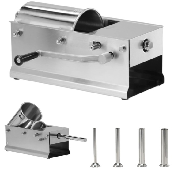 Wykonana ze stali nierdzewnej SS304, zapewnia trwałość i higienę. Wyposażona w cztery lejki (16, 22, 32, 38 mm) umożliwia tworzenie kiełbas o różnej grubości. Dwustopniowa przekładnia zębatkowa pozwala na wybór prędkości napełniania, a silikonowa uszczelka tłoka zapobiega wyciekom.