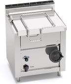 Pokrywa zamocowana na zawiasach balansowanych automatycznie. Zbiornik gotujący z dnem i ściankami wykonanymi ze stali nierdzewnej inox AISI 304, z ręcznym przechyłem do 80°, pokryty mikrosferyczną ceramiką zapobiegającą przyleganiu potraw oraz z zaokrąglonymi kątami. Dno zbiornika wykonane ze stali o grubości 10 mm, przyspawane z zewnątrz w celu zapewnienia lepszej przewodności cieplnej. Jednolite podgrzewanie zapewnione dzięki palnikom mającym bezpośredni kontakt z dnem. Zapłon piezoelektryczny, z silikonową osłoną i palnikiem pilotującym.. Doskonały dla gotowania potraw duszonych. Termostatyczny zawόr do liniowej regulacji temperatury z zakresu od 100 do około 300°C , dzięki pokrętłu z 7-ioma pozycjami. Osłona termoelektryczna. Nόżki nastawne.