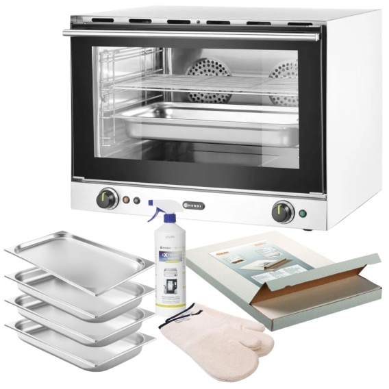 Piec konwekcyjny z nawilżaniem 3,5 kW 230V 4xGN 1/1 Zestaw L z pojemnikami, rusztem, płynem do czyszczenia i rękawicami 699x608x580 mm