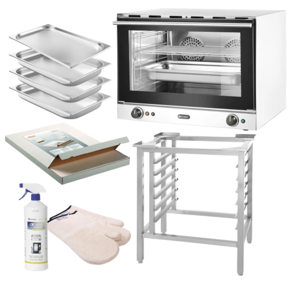Piec konwekcyjny z nawilżaniem 3,5 kW 230V 4xGN 1/1 Zestaw XXL z pojemnikami, rusztem, płynem do czyszczenia, rękawicami, papierem do pieczenia i podstawą 699x608x580 mm