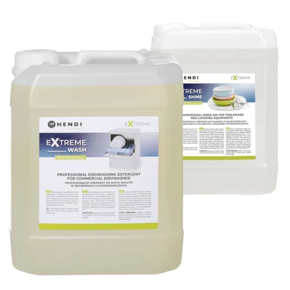 Płyn Myjący 20L + Nabłyszczacz 10L Hendi - Profesjonalny zestaw do zmywarek gastronomicznych. Płyn myjący alkaliczny, skoncentrowany, bezpieczny dla różnych rodzajów naczyń. Płyn nabłyszczający kwasowy, skoncentrowany, zapobiega osadom wapniowym. Idealny dla restauracji, barów, kawiarni, kuchni zakładowych, cateringowych i placówek oświatowych.