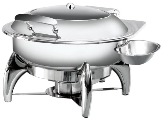 Model wykonany jest z wysokiej jakości stali nierdzewnej, co zapewnia odporność na intensywne użytkowanie oraz łatwe utrzymanie higieny. Podgrzewacz posiada przeszkloną pokrywę zamontowaną na zawiasie z funkcją powolnego opadania, co zwiększa komfort i bezpieczeństwo użytkowania. Okrągły kształt oraz inox wykończenie dodają urządzeniu nowoczesnego wyglądu, który doskonale wpisuje się w estetykę profesjonalnych bufetów.