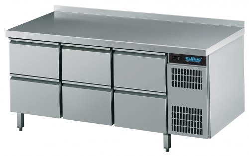 Stół chłodniczy dla GN 1/1, 6 szufl ad o wysokości użytkowej 216 mm, blat z rantem tylnym h=50 mm (typ C), parownik umieszczony na górze wewnątrz urządzenia, wymuszony obieg powietrza, automatyczne odszranianie i odparowanie kondensatu za pomocą gorącego gazu, elektroniczny sterownik, higieniczne wykonanie, gotowy do podłączenia.