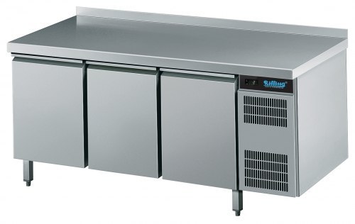 3-drzwiowy stół mroźniczy dla GN 1/1, blat z rantem tylnym h=50 mm (typ C), parownik umieszczony centralnie w komorze, wysokowydajny system wymuszonego obiegu powietrza , automatyczne odszranianie i odparowanie kondensatu za pomocą gorącego gazu, elektroniczny sterownik, higieniczne wykonanie, gotowy do podłączenia.