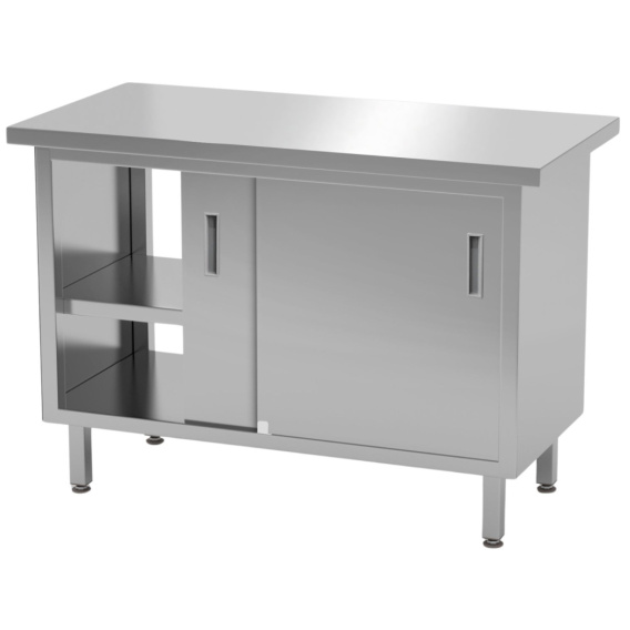 • Wysokiej jakości szafka gastronomiczna przelotowa z blatem roboczym i wewnętrzną półką, wykonana ze stali nierdzewnej AISI 430 (możliwość AISI 304)
