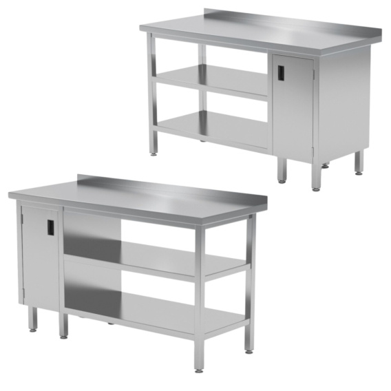 • Wysokiej jakości stół gastronomiczny z blatem roboczym, 2 półkami i szafką z drzwiami na zawiasach, wykonany ze stali nierdzewnej AISI 430 (możliwość AISI 304)