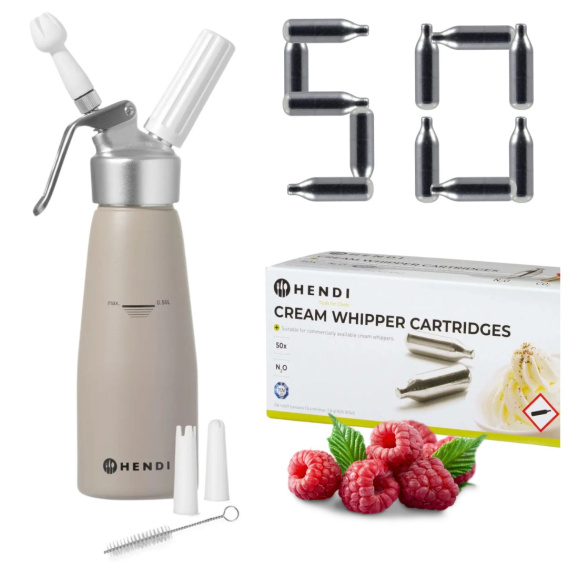 Syfon do Bitej Śmietany 0,5l Beżowy Mega Paka Naboi N2O 50 szt. Hendi 975893