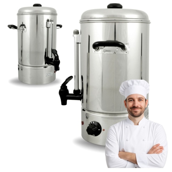 Elektryczny warnik do wody WB-10A o pojemności 10 litrów, wykonany ze stali nierdzewnej. Wyposażony w wskaźnik napełnienia, nienagrzewające się uchwyty i zakrytą grzałkę. Idealny dla bufetów i cateringu.
