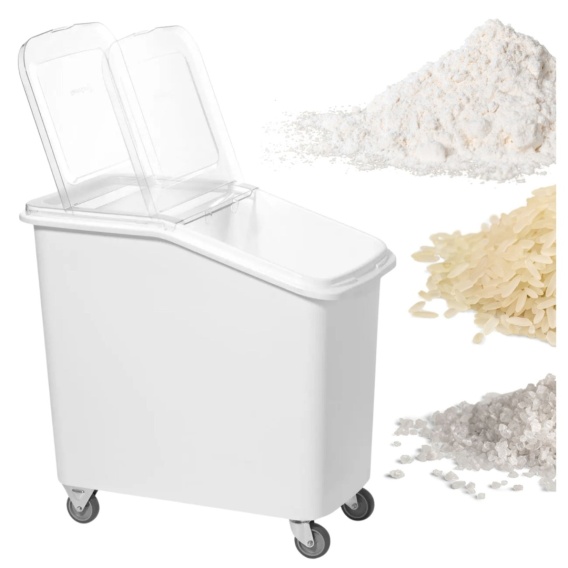 Wózek gastronomiczny Hendi 877920 to praktyczne rozwiązanie do przechowywania i transportu mąki, cukru, ryżu, kaszy oraz innych produktów sypkich w dużych kuchniach, piekarniach i zakładach produkcyjnych. Ułatwia codzienną organizację pracy i utrzymanie higieny w magazynie surowców.