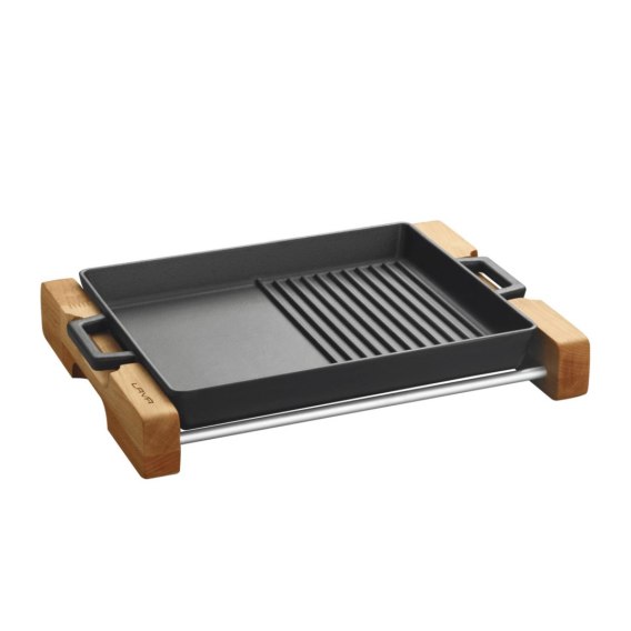 Lava Żeliwna Patelnia Grillowa Prostokątna Hybrydowa 30x39.6x(H)6.2cm z Drewnianą Podstawą