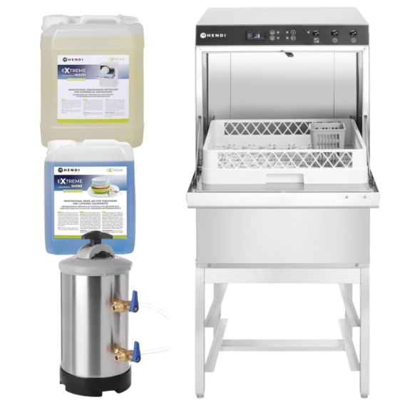 Zmywarka gastronomiczna Hendi 237366 z pompą, dozownikami, zestawem płynów, zmiękczaczem wody i podstawą