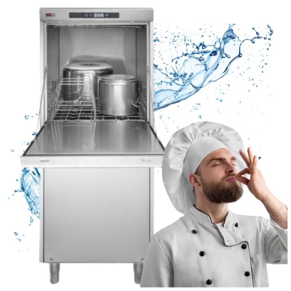 Model posiada cztery programy mycia (60, 120, 180 i 240 sekund), dwie pompy myjące oraz system stałej temperatury płukania ABT z pompą wspomagającą. Sterowane czasowo dozowniki środka myjącego i płuczącego zapewniają optymalne dozowanie, a termometry bojlera i wanny umożliwiają stałą kontrolę temperatury. Wysokość drzwi 50 cm pozwala na wygodne wkładanie dużych naczyń.