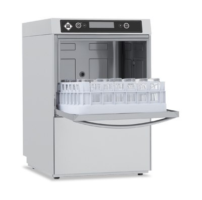 Wydajność: 40/30/24 koszy/h; 3 programy standardowe (cykle: 90", 120", 150") + programy specjalne; wymiary kosza: 400 x 400 mm ; wysokość otworu drzwi - 320 mm; maksymalna wysokość szklanki - 300 mm, talerza - 320 mm; dwupłaszczowa obudowa; zużycie wody: 1,5 l/cykl; bojler atmosferyczny z pompą płukania; ramiona górne i dolne ze stali nierdzewnej; sterowanie elektroniczne - inteligentny panel sterowania; podgląd temperatury mycia i płukania oraz innych parametrów pracy na wyświetlaczu; licznik cykli mycia; autodiagnostyczny system wykrywania usterek z komunikatorem błędów; pompa wzmacniająca ciśnienie płukania; termostop - gwarantowana temperatura płukania wg HACCP ; softstart - system płynnego zwiększania ciśnienia przy rozpoczęciu mycia ; energy saving - oszczędzanie energii w czasie nieużywania zmywarki; tłoczona wanna z nierdzewnymi filtrami; automatyczny start po zamknięciu drzwi; program samoczyszczenia; program opłukiwania szkła zimną wodą; dozownik środka myjącego i płuczącego sterowany czasowo; kontrolki pracy i grzania; regulowany termostat bojlera; kosze w zestawie: 2x uniwersalny, pojemnik na sztućce; pompa odpływu wbudowana ; pakiet chemii w promocyjnej cenie przy zakupie ze zmywarką; OPCJE: specjalny zestaw do mycia szkła na dwóch poziomach